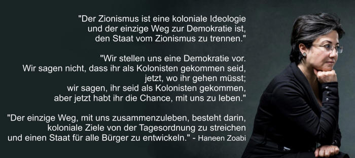 Israel, so betonte Zoabi, dürfe nicht weiter versuchen, die Palästinenser - die indigenen Völker - zu vertreiben und zu ersetzen, sondern mit ihnen zusammenzuleben. "Der einzige Weg, mit uns zusammenzuleben, besteht darin, koloniale Ziele von der Tagesordnung zu streichen und einen Staat für alle Bürger zu entwickeln. Es wird nicht auf Kosten unserer Identität und unserer Verbindung zu den Palästinensern überall gehen.