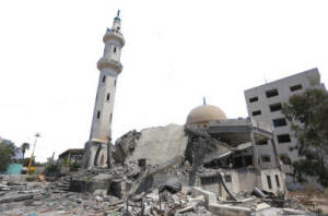 Ein Drittel der Moscheen im Gazastreifen durch israelische Angriffe zerstört. - 29. August 2014 - Der israelische Angriff auf Gaza (2014) zerstörte 73 Moscheen in 51 Tagen, während 205 andere teilweise zerstört wurden, sagte ein Regierungsbericht.