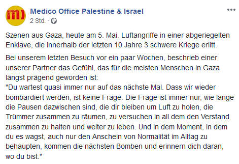 Nein, Eskalationen beginnen nicht mit Raketen auf Israel. - Orly Noy - 5. Mai 2019 - Israel hat möglicherweise die Macht, sich selbst und dem Rest der Welt eine Geschichte der Opferrolle zu erzählen. In Wirklichkeit missbraucht sie seit über einem Jahrzehnt zwei Millionen belagerte Gazisten.