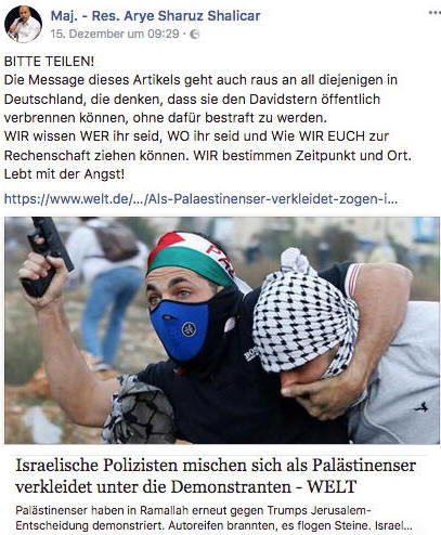 Herr Shalicar veröffentlichte auf seiner Facebook-Seite am 15. Dezember 2017 einen Text (in deutsch und englisch), der zur Pflege der deutsch-isrealischen Beziehungen "auf Bürgerebene" eher ungeeignet war. Dies hat er nach kurzer Zeit offensichtlich selbst eingesehen, weswegen er den Eintrag vier Tage später löschte.[2] Sich auf das Verbrennen israelischer Fahnen in Deutschland beziehend lautet die deutsche Version des Textes: