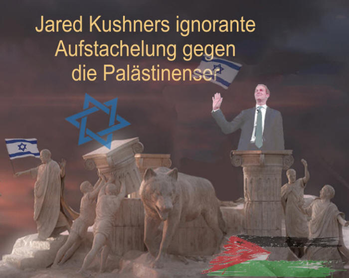 Jared Kushners ignorante Aufstachelung gegen Palästinenser - Jonathan Ofir - 9. Mai 2019 - Letzte Woche sprach der Berater und Schwiegersohn von Präsident Donald Trump, Jared Kushner, bei einem Abendessen, das vom Washington Institute for Near East Policy (einem Spin-off der israelischen Lobbygruppe AIPAC) ausgerichtet wurde. Zur Frage der "Zwei-Staaten-Lösung" im Zusammenhang mit dem versprochenen "Deal des Jahrhunderts" schlug er vor: "Lasst es uns einfach nicht sagen".