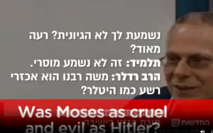 Gestern lief auf dem israelischen Kanal 13 eine Videoaufzeichnung von Rabbinerpädagogen an der staatlich geförderten militärischen Vorbereitungsakademie Bnei David in der West Bank Siedlung von Eli. Die Rabbiner begrüßen Hitlers nationalsozialistische rassistische Ideologie als "100% korrekt" und kritisieren sie nur, weil sie nicht auf die richtigen Menschen angewendet wurde - das heißt, die Juden sollten die Herrenrasse sein, und Nichtjuden die " Untermenschen ".