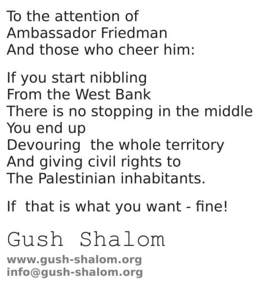 Also, wenn überhaupt, Friedman war auf sein bestes Verhalten - zumindest für ihn -, als er letzte Woche von David Halbfinger in der New York Times fachmännisch interviewt wurde. Er sprach nicht als Privatmann, sondern als Botschafter der USA, der in seiner offiziellen Residenz (die jetzt nach Jerusalem verlegt wurde) sitzt. Und aus seiner Sicht machte er ein Zugeständnis. Friedman glaubt fest daran, dass Israel ein Recht auf das gesamte Westjordanland hat, aber in dem Interview war er bereit zu akzeptieren, dass "Israel das Recht hat, einige, aber nicht alle Gebiete des Westjordanlandes zu behalten". Das war Friedman in seiner gemäßigtesten Form.