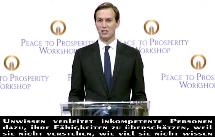 Was Kushner vermitteln will, ist, dass Frieden im Nahen Osten durch den Aufbau von Infrastrukturen in den Bereichen Handel, Verkehr, Tourismus und digitale Dienstleistungen erreicht werden kann, wobei zu vergessen ist, dass Israel der Hauptgrund für die Zerstörung dieser Infrastruktur ist. Welche unpolitischen Projekte auch immer vorgeschlagen werden, sie werden unzureichend und erfolglos sein, obwohl sie kurzfristig das Gegenteil beweisen können, denn die Ursache des Problems liegt in der Existenz eines Apartheid-Staates in Palästina.Jared Kushner besetzt den Senior-Berater in Trumps aktueller Regierung und lebt in einem postkolonialen Amerika, das ohne den Völkermord an seiner indigenen Bevölkerung heute nicht bekannt gewesen wäre, und besteht darauf, den Eindruck zu erwecken, den Palästinensern einen Gefallen zu tun, indem er "Frieden" und "Wohlstand" in ihre "reaktionäre" und "armselige" Heimat bringt. Diese koloniale weiße supremazistische Mentalität fordert die Palästinenser auf, der gute Sklave zu sein, indem sie gehorchen und zusammenarbeiten. Der gute Palästinenser ist derjenige, der die totale Unterwerfung unter seinen Meister zugibt. Von den Palästinensern wird erwartet, dass sie der amerikanischen Regierung dafür danken, dass sie sie vor sich selbst gerettet haben. Anfang dieses Monats äußerte sich Kushner rassistisch über die Unfähigkeit der Palästinenser, sich selbst zu regieren. Deshalb brauchen die Palästinenser eine überlegene Seite, die fähig und fortschrittlich ist, um die Kontrolle über sie zu übernehmen und ihre Angelegenheiten zu regeln.