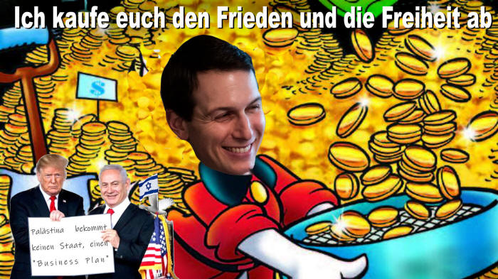 Es bleibt zu hoffen, dass auch die überwiegende Mehrheit der sog. Internationalen Völkergemeinschaft diesen Deal zurückweisen wird. Ein derartig ambitionierter Plan für den Aufbau eines wirklich eigenständigen palästinensischen Staates ist zweifellos richtig und absolut zu unterstützen, allerdings als zweiter Schritt nach einer fairen und völkerechtskonformen Lösung der zahlreichen politischen Probleme. Ob sich dann allerdings Trumps, Kushners und Konsorten ähnlich massiv engagieren werden, ist kaum anzunehmen. Denn sie sind - und das muss man einfach unmissverständlich aussprechen - Teil der internationalen prozionistischen Israel-Lobby.