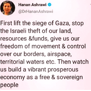 Nur für den Fall, dass einer dieser Wiesel, die zu unserer Kapitulation auffordern, irgendein Interesse an dem haben könnte, was wir Palästinenser wollen, hier ist, wie es das Exekutivmitglied der PLO, Dr. Hanan Ashrawi, ausdrückte: Quelle
