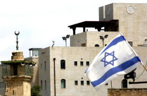 *Israels ‚Existenzrecht‘* - Von den 1950ern an bis in die 1990er bestand Israel darauf, dass arabische Staaten sein „Existenzrecht“ anerkennen – eine Formulierung, die kein anderer Staat je gefordert hat, weil nach dem Völkerrecht ein Staat de facto oder de jure anerkannt werden kann, aber keiner hat ein legales „Existenzrecht“. Um die 1970er, als die Palestinian Liberation Organization (PLO) nachdrücklich das palästinensische Volk aufriefen, ihr Recht auf Selbstbestimmung zu realisieren; Israel konterte mit der sogenannten „Israelischen Selbstbestimmung“. Das wurde im September 1972 durch den israelischen Außenminister Abba Eban ausgedrückt, dass die „israelische Selbstbestimmung moralischen und historischen Vorrang habe über die palästinensische Selbstbestimmung, obwohl es diese nicht ganz durchführe“. Bild: Israels Flagge flattert über einer israelischen Siedlung in Hebron