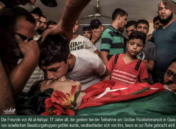 Die Soldaten feuerten scharfe Geschosse und gummierte Stahlkugeln auf die Demonstranten ab, die sich in vielen Lagern entlang der Grenze versammelten und dabei Ali Sami Ashqar, 17, aus dem Flüchtlingslager Jabalia im Norden Gazas töteten, nachdem sie ihn mit einer scharfen Kugel auf die Brust geschossen hatten.
