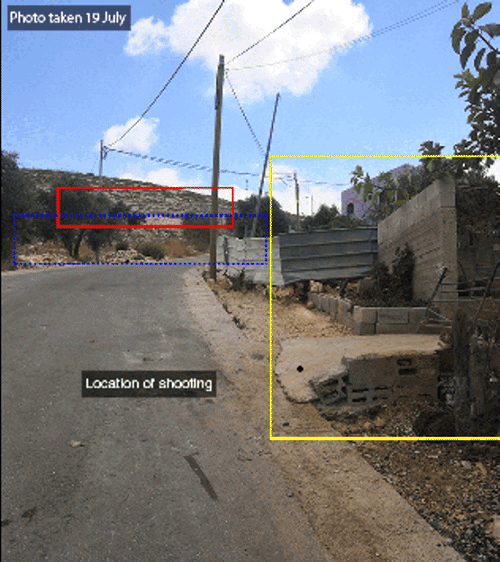 Bekannte Bewegungen von Demonstranten und israelischen Soldaten um das Ostende von Kafr Qaddum am 12. Juli 2019. (Eine Forensische Analyse)Am 12. Juli 2019 wurde dem neunjährigen Abd el-Rahman Yasir Shatawi von einem israelischen Soldaten in der palästinensischen Stadt Kafr Qaddum im besetzten Westjordanland in den Kopf geschossen. Er bleibt im Krankenhaus, und sein langfristiger Zustand ist unklar.
