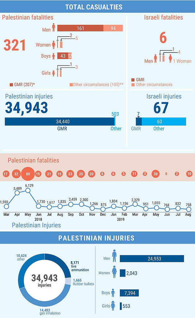 *Zu den Verletzten der GMR gehören Todesopfer und Verletzungen, die während der Freitagsproteste in der Nähe des Zauns, der Proteste gegen die Marineblockade am Strand und der nächtlichen Aktivitäten in der Nähe des Zauns gemeldet wurden.