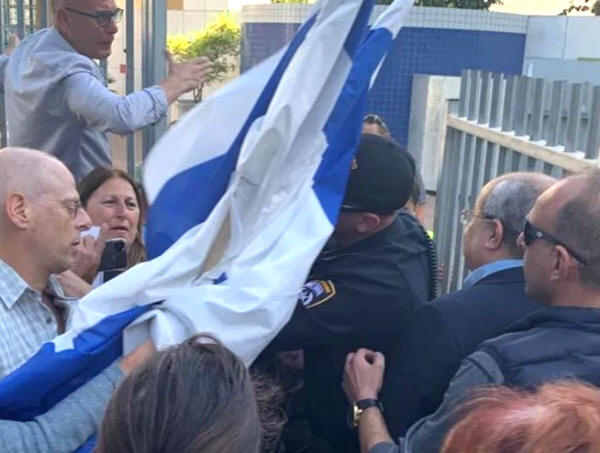 "Ich wurde eingeladen und kam, um zuzuhören und gehört zu werden. Ich wurde von einem Demonstranten mit einem Flaggenstock und einem Plakat getroffen, und auf dem Weg nach draußen wurden Sand und eine Handvoll Erde auf mich geworfen", sagte MK Tibi von der Joint List auf Twitter.