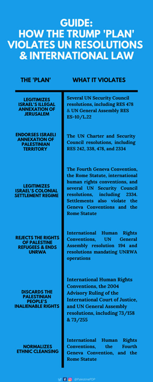 Dieser Vorschlag versucht die israelische Okkupation zu rechtfertigen und die Geschichte des palästinensischen Volkes und seine unveräußerliche Rechte zu wiederrufen; das gilt im Besonderen für das Rückkehrrecht der palästinensischen Flüchtlinge und das Recht auf Selbstbestimmung durch den Versuch, die palästinensische Frage komplett und endgültig aus der Welt zu schaffen.