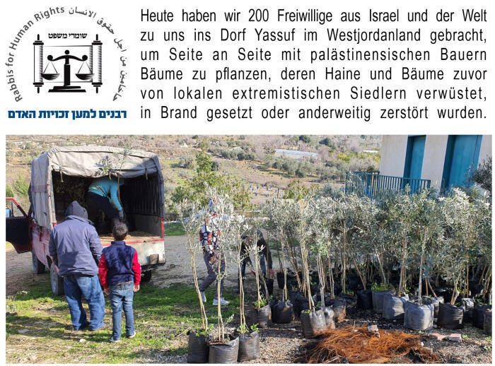 RHR-Exekutivdirektor Avi Dabush: "Wir sind gekommen, um zusammen mit ländlichen palästinensischen Bauern, die unter systematischer Gewalt und Schikanen leiden, Olivenbäume zu pflanzen und gemeinsam Tu B'Shevat, den jüdischen Feiertag der Bäume, zu ehren, in der Hoffnung, dass diese Art von Aktivitäten Optimismus und Solidarität zwischen uns und unseren palästinensischen Partnern schaffen wird. Es ist traurig und demütigend zu sehen, wie unterschiedslos und willkürlich die Armee "geschlossene militärische" Befehle erteilt, um Aktivitäten zu verhindern, bei denen es nur um Landwirtschaft und Frieden geht. Ich kann nicht verstehen, warum die Armee das Pflanzen von Olivenbäumen und den Verzehr von Trockenfrüchten als "Versuch, den Befehl zu missachten" interpretieren würde. Sicherlich ist der einzige Befehl, der hier verletzt wird, der einzige, der wirklich relevant ist - die traditionelle Aufforderung, auf Tu B'Shevat Bäume zu pflanzen". Quelle facebook