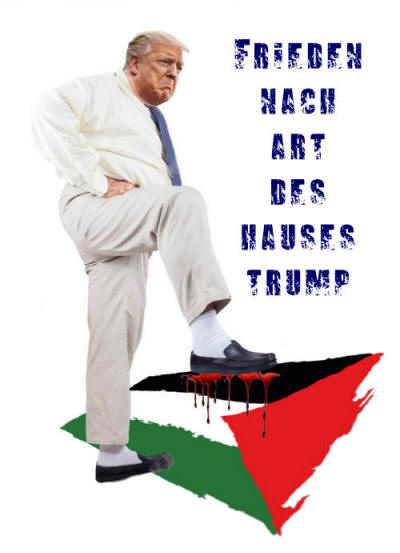 Alice Rothchild - 26. Februar 2020 - Übersetzt mit DeepLDer Trump-Administrationsplan für Israel/Palästina mit dem ironischen Titel "Peace to Prosperity: a vision to improve the lives of the Palestinian and Israeli people" ist ein fehlerhaftes, ahistorisches Dokument, das im Grunde ein Geschenk an die israelische Regierung ist, das einen Großteil des Status quo bestätigt und internationalen Segen für ihn gibt. Das Dokument ist in klassischer israelischer Haschischsprache verfasst: Israelis sind friedliebend, Palästinenser werden von Gewalt und Terrorismus geplagt. Der Kampf wird als hartnäckig beschrieben, als ein Kampf der Religionen und Kulturen, der nur gelöst werden kann, wenn man die Geschichte und das Völkerrecht ignoriert und technokratische Lösungen für politische Probleme und Fragen der sozialen Gerechtigkeit vorschlägt.