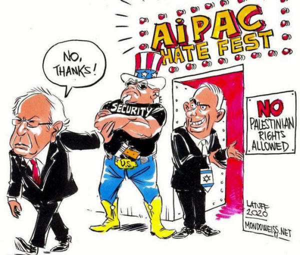 Sanders machte Anfang der Woche auch in Israel Schlagzeilen und kündigte an, dass er nächste Woche nicht an der jährlichen AIPAC-Konferenz teilnehmen wird, weil die Organisation "Führern, die Bigotterie und gegen die Grundrechte sind", eine Plattform für das palästinensische Volk bietet.