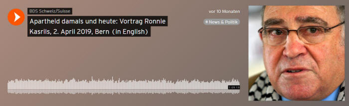 Kurz nach der Israeli Apartheid Week war ein prominenter Gast in Bern und Genf:Der südafrikanische Politiker und Aktivist Ronnie Kasrils sprach über den Widerstand gegen die Apartheid in seiner Heimat und die Situation heute in Israel/Palästina.