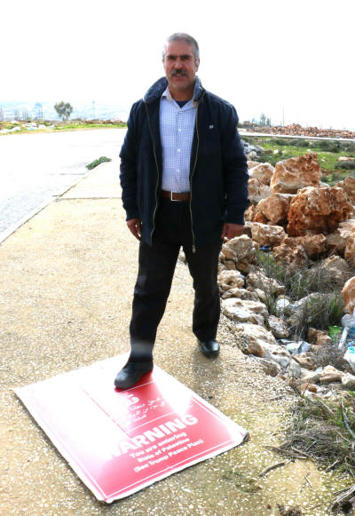 Bild links - Ein Bewohner des Dorfes Qusra tritt auf ein Regavim-Schild (MEE/Akram al-Waara)