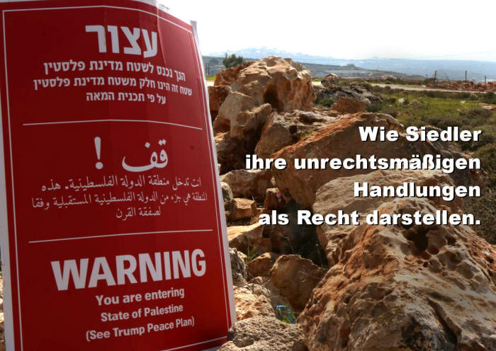 Berühmt für ihr Eintreten gegen die palästinensische Selbstbestimmung und die Zwei-Staaten-Lösung, wollte Regavim eine Erklärung abgeben: Die Existenz eines künftigen palästinensischen Staates wäre eine Bedrohung für ihre Vision der israelischen Annexion der gesamten Westbank. Indem sie an künftig vorgeschlagenen Grenzpunkten zum palästinensischen Staat Schilder anbrachten, machten sie die Siedler auf die „Gefahren aufmerksam, denen sie ausgesetzt sein werden“ an „33 Punkten, auf die jüdische Einwohner keinen Zugang mehr haben werden, 33 Punkte, von denen aus Terrorakte nicht zu verhindern sind ”. Für Regavim ist der Trump-Plan - der einen diskontinuierlichen und entmilitarisierten palästinensischen "Staat" mit wenig Souveränität und umgeben von vollständig von Israel annektierten Siedlungen vorschlägt - unzureichend. Stattdessen sagt die Gruppe, dass es die Siedlungen selbst sein werden - die nach internationalem Recht illegal sind -, die "zu isolierten Enklaven werden, die vollständig vom neu gegründeten [palästinensischen] Staat umgeben sind"."Wenn die Palästinensische Autonomiebehörde entscheidet, dass sie einen Staat will, und der nächste amerikanische Präsident entscheidet, dass sie die Anforderungen erfüllt haben, wird am nächsten Morgen der 'Deal des Jahrhunderts' in Kraft treten - und die Grenze Palästinas wird direkt vor den Toren der jüdischen Gemeinden Judäas und Samariens liegen", sagte die Gruppe in einer Erklärung - wobei sie den israelischen Begriff für die Westbank verwendete. "Die roten Alarme der letzten Tage im Süden Israels veranschaulichen, wie es ist, neben einem terroristischen Staat zu leben", so die Gruppe in einer Erklärung.
