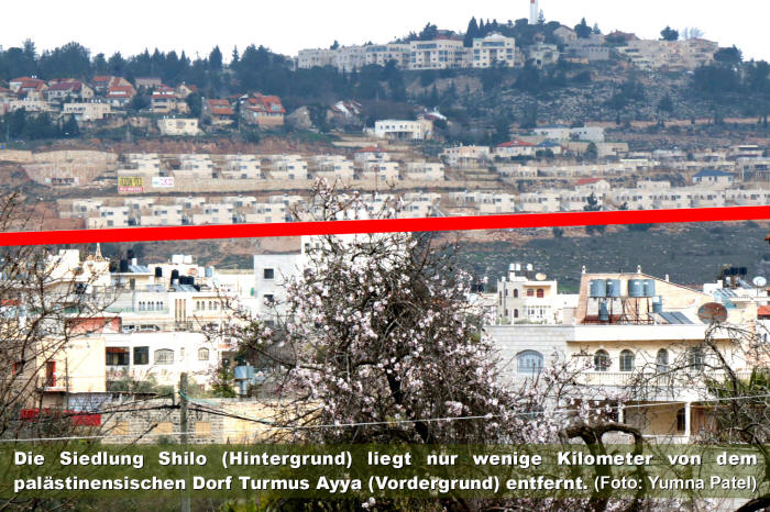 Die Siedlung Shilo (Hintergrund) liegt nur wenige Kilometer von dem palästinensischen Dorf Turmus Ayya (Vordergrund) entfernt. (Foto: Yumna Patel)