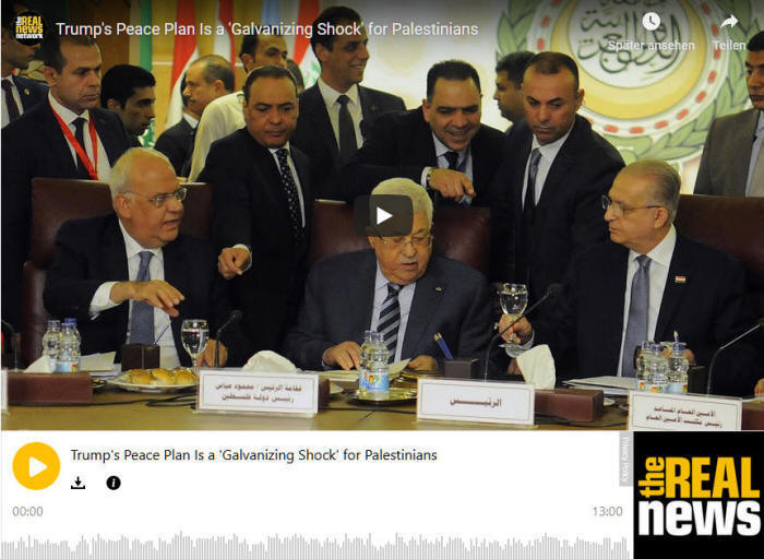 Es ist sicherlich ein Moment, der dazu dienen sollte, die Palästinenser zu vereinen, denn die Palästinenser lehnen sämtliche Elemente dieses Plans völlig einhellig ab. Greg Wilpert: Wie ich bereits in der Einleitung erwähnt habe, scheint es, dass die UNO, die EU, die Arabische Liga und >>>