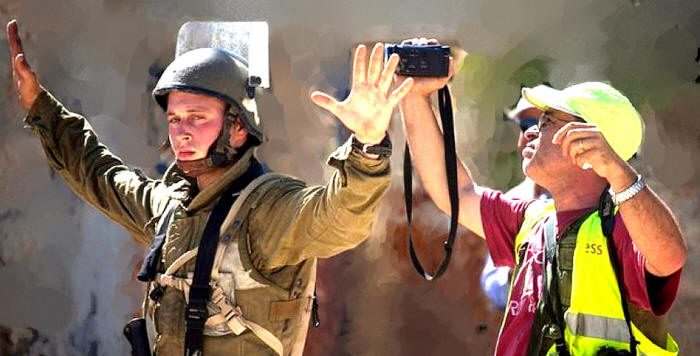 Ein israelischer Soldat hindert einen Journalisten daran, in dem Dorf Nabi Saleh im Westjordanland zu filmen. (Blitzlicht90)