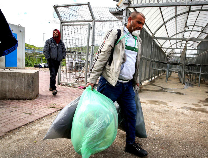Palästinensische Arbeiter aus der Stadt Hebron im Westjordanland tragen persönliche Gegenstände, als sie am 18. März 2020 an einem Kontrollpunkt in Tarqumiya in Israel abgesetzt werden. Foto von Wisam Hashlamoun