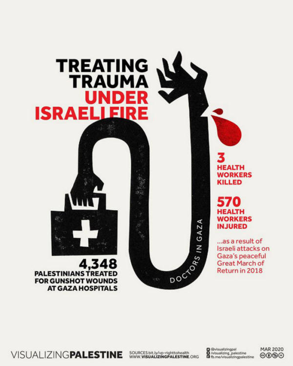 So wie wir von einer gesunden Zukunft frei von COVID-19 träumen, träumen wir auch von einer gesunden Zukunft für die Palästinenser, frei von militärischer Besetzung, Blockade und Diskriminierung. Der Weg zur Gesundheit endet nicht damit, dass wir ein Virus besiegen. Wir müssen uns an die Seite der Schwächsten stellen und starke Bewegungen aufbauen, um robuste Menschenrechte zu erreichen, die die Grundlage für eine gute Gesundheit bilden. Quelle Visualizing Palestine >>>