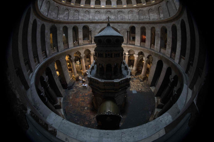 Mönche besuchen einen orthodoxen Oster-Gottesdienst in der Kirche des Heiligen Grabes in der Altstadt von Jerusalem, nachdem die Kirche als Vorsichtsmaßnahme gegen den Covid-19 am 11. April 2020 geschlossen worden war. - Foto Afif Amira