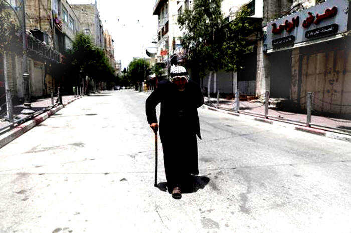älteren Palästinenser (erkennbar an seinem Shawl), alle mit Masken