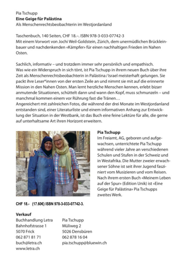 „Eine Geige für Palästina“ Rezension von Ekkehart Drost Ein weiteres Buch über Palästina, über den Nahostkonflikt in der nahezu unendlichen Reihe bisher erschienener Bücher, Reportagen, Fotobände und Aufsätze? Was macht dieses kleine, sehr persönliche Buch der pensionierten Schweizer Lehrerin Pia Tschupp dennoch so lesenswert? Die Autorin schildert, ohne belehren zu wollen, authentisch und voller Empathie einzelne Aspekte palästinensischen Lebens unter der israelischen Besatzung. So erzählt sie über den 27jährigen Schafzüchter Zafer, den sie im Spital besucht hat, weil er von den besonders gewalttätigen Siedlern aus Yitzar im Norden der Westbank schwer verletzt wurde – seine Schafe fand man mit aufgeschlitzten Kehlen auf seiner Weide. Zafer, der sich in Deutschland und Schweden als Schafzüchter weiterbildete, wird dennoch nicht aufgeben: „To exist is to resist“ – das gewaltfreie Motto der Palästinenser ist auch für ihn Leitschnur. Sie besuchte die Familie Tamimi im kleinen Dorf Nabi Saleh nordwestlich von Ramallah, deren Widerstand gegen die Besatzung, angeleitet durch die vielen „unknown leaders“, immer freitags mit einem „Weg zur Quelle“ (so der Titel des Buches von Ben Ehrenreich) stattfand, unterstützt durch viele israelische und internationale NGOs. 2016 hat Pia Tschupp schon einmal Palästina besucht, damals mit einem Chor und Orchester auf Konzertreise. Auf jener Musikreise war es, als sie zum ersten Mal vom Programm des Weltkirchenrates (EAPPI) hörte – und sogleich Feuer fing. Nach Palästina brachte sie 2018 eine Geige mit, weil Instrumente an den Schulen Mangelware sind. Von Januar bis April 2018 erlebte sie dann den Alltag in einem Teil der Welt, in dem die Begegnung zwischen Nachbarn unterschiedlicher Kulturen durch physische und psychische Mauern erschwert wird, wo Misstrauen und Angst auf beiden Seiten allgegenwärtig sind. Eindrücklich ist auch das Kapitel, in welchem Tschupp nach der Heimkehr ihr Leben in Palästina mit jenem in ihrem Schweizer Heimatdorf Densbüren vergleicht. «Eine Geige für Palästina», so der Titel des Buches, helfe ihr, das Erlebte zu verarbeiten. «Noch wichtiger ist mir aber, dass möglichst viele Menschen auf die unglaublich schwierigen, oft menschenunwürdigen Umstände aufmerksam werden, in denen die Palästinenser seit über 50 Jahren leben», betont die Autorin. Eine besonders nachhaltige Wirkung hat die Lektüre bei zwei Schweizer Lesern ausgelöst: Publiziert wurde das Buch Anfang Mai – «und bereits jetzt haben sich zwei Personen gemeldet, die ein Cello und eine Geige für Palästina spenden wollen!“ Dass das Vorwort von Jochi Weil-Goldstein stammt – einem in Zürich lebenden, bekannten Schweizer Juden und unermüdlichem «Brückleinbauer» im Bestreben um einen nachhaltigen Frieden im Nahen Osten – verleiht dem Buch zusätzliches Gewicht. Jochi Weil, der mit Israel in den Grenzen vor dem Juni-Krieg von 1967 kritisch verbunden bleibt, schreibt: «Pia Tschupps Sichtweise ist einseitig, solidarisch mit den unterdrückten, oft auch gedemütigten Menschen in Palästina. Das sind natürliche Reflexe, adäquate Reaktionen auf Ungerechtigkeiten.» Das Werk soll auf Englisch übersetzt werden, der berühmte Educational Bookshop in Ostjerusalem will es ins Sortiment aufnehmen. Neben Tschupps Schilderungen ihrer Erlebnisse enthält das Buch auch zahlreiche Fotos, Lyrik sowie die wichtigsten Informationen zur Entstehung und zum Stand des Nahostkonflikts, Kartenmaterial zur Entwicklung Palästinas von 1947 bis 2017, abgerundet durch ein Kapitel mit palästinensischen Gedichten und Liedtexten. Mit ihrem Buch hat Pia Tschupp nun einen Weg gefunden, nachzuwirken, wachzurütteln, sich für die Sache der Gerechtigkeit und für gleiche Rechte für Israelis und Palästinenser einzusetzen. «Die zahlreichen Reaktionen, die ich auf das Buch erhalten habe, machen Mut. Ich darf miterleben, wie meine Erzählungen immer mehr Menschen erreichen, hier in der Schweiz und auch in Palästina.»