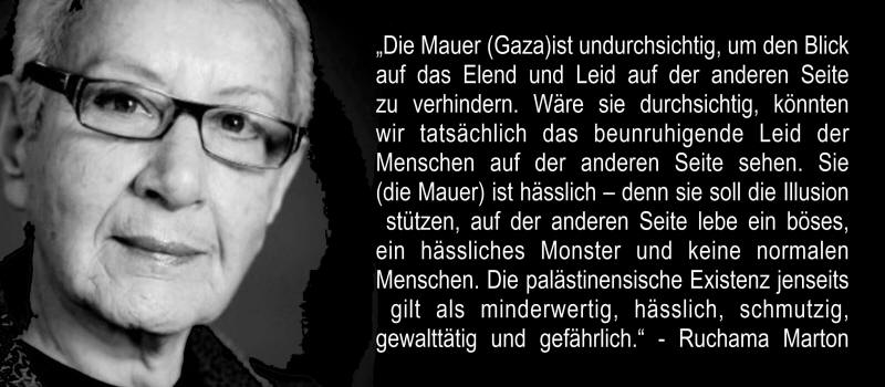 Man muss, wenn man von Israels Mauern spricht, unbedingt auch die Aussagen der israelischen Psychoanalytikerin Ruchama Marton hinzufügen, die in einmaliger Weise die Motive bloßgelegt hat, warum die Israelis solche abgrenzenden und trennenden monumentalen Zäune bauen. Sie sieht in der Mauer nicht nur eine physische Barriere, die der Sicherheit dient, sondern auch eine metaphorische Blende, die die Existenz des palästinensischen Volkes insgesamt ausblenden soll. Von einer psychologischen Warte aus ermöglicht diese Blende es den jüdischen Israelis, das Leid und die Menschlichkeit der Bewohner der anderen Seite zu vergessen. Ruchama Marton schreibt: „Ein brauchbarer Ansatz, einige der psychologischen Mechanismen zu verstehen, die mit der Mauer zu tun haben, ist das Prinzip der Spaltung. (…) Es lässt nur zwei Extreme zu, die Welt ist in ‚gut‘ und ‚böse‘ gespalten, ohne ein Mittleres. Die Spaltung ist der primitivste Abwehrmechanismus, auftretend bei übergroßer Verängstigung und einem Bedürfnis, unerträglich starke positive und negative Emotionen voneinander zu trennen. Ironischerweise erfordert diese begriffliche Verarbeitung laufend psychologische Energie und ist als Langzeitlösung nicht sehr effektiv, denn die Ängste werden eher blockiert als erforscht, verarbeitet und schließlich abgebaut.