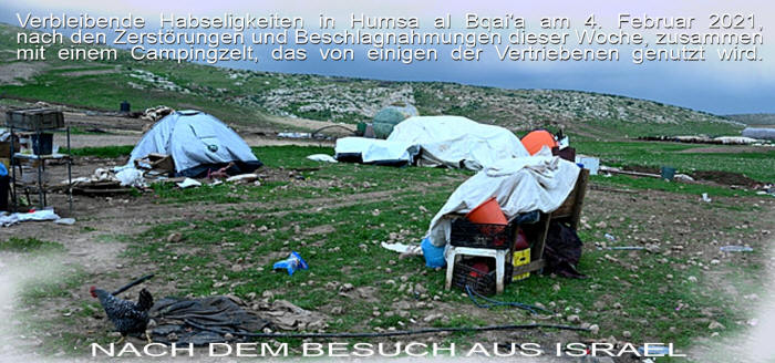 Vertreter der Vereinten Nationen trafen sich gestern mit der palästinensischen Beduinengemeinschaft von Humsa al Bqai'a im nördlichen Jordantal des Westjordanlandes. Am 1. und 3. Februar wurden 60 Menschen, darunter 35 Kinder, aus ihren Häusern vertrieben und ihr Hab und Gut von israelischen Streitkräften beschlagnahmt oder zerstört. Unter den beschlagnahmten Gegenständen befanden sich Zelte, die ihnen als humanitäre Hilfe zur Verfügung gestellt wurden, nachdem im November 2020 bereits 83 andere Gebäude abgerissen worden waren - die größte Einzelzerstörung seit 2009.