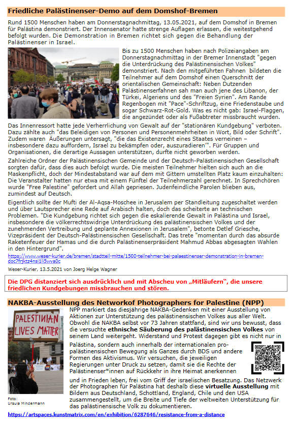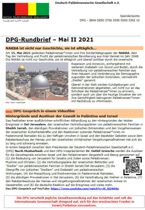 Hintergründe der Gewalt in Palästina und Israel, Mai 2021 Ein Gespräch zwischen dem Präsidenten der Deutsch-Palästinensischen Gesellschaft e.V. (DPG) Nazih Musharbash und dem DPG-Vizepräsidenten Dr. Detlef Griesche zu den Hintergründen der Gewaltspirale zwischen Israel und den Palästinensern mit Bezug auf (1) Bedeutung von Jerusalem für Israelis und Juden sowie Palästinenser und Moslime/Christen, (2) Vertreibungspläne der israelischen Behörden und "Siedler" von palästinensischen Familien in Sheik Jarrah/Ost-Jerusalem, (3) Übergriffe von jüdischen "Siedlern" und Diebstahl von palästinensischen Wohnungen, (4) Missachtung und Erschwernisse im Fastenmonat Ramadan, (5) ständige Provokationen in Ost-Jerusalem, (6) Verschiebung der Wahlen in Palästina, (7) Raketenbeschuss der Hamas und Vergeltungsmaßnahmen der israelischen Armee im Gazastreifen und (8) die deutsche Reaktion auf die Ereignisse und vieles mehr.