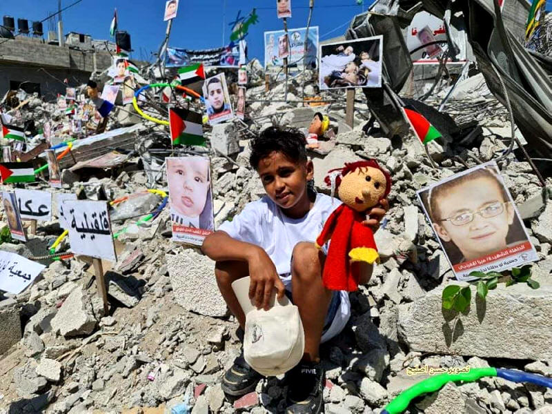 Eine palästinensische Jugendinitiative in #Gaza hat auf den Trümmern von Häusern, die von israelischen Luftangriffen bombardiert wurden, eine Galerie mit Bildern der 97 palästinensischen Kinder veranstaltet, die von "Israel" während seiner jüngsten Aggression gegen den belagerten Streifen getötet wurden.