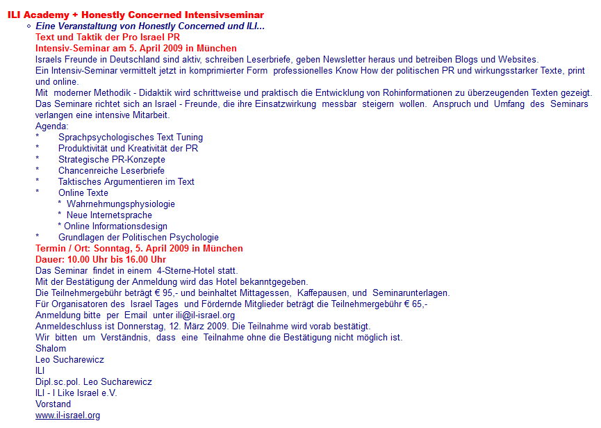 Im desinformieren, im konditionieren sehe ich die eigentliche Aufgabe von Mena-Watch und den vielen anderen Instituten, angeblichen NGOS. Sie setzen, neben der Steuerung aus Israel; die Amateurhafte Arbeit der Desinformationsgruppe "Honestly Concerned Mailingliste" und die Honestly Concerned sowie ILI (»Think Tank für Israel«) auf.