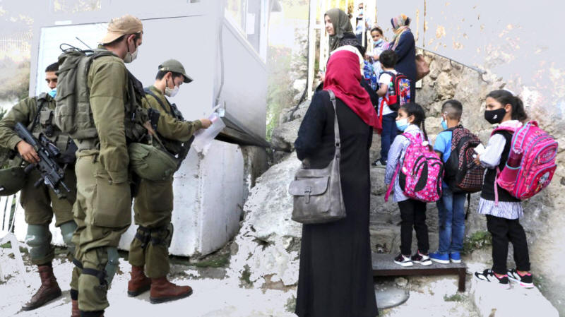 Palästinensische Schüler und Lehrer warten darauf, dass israelische Soldaten ihnen erlauben, einen militärischen Kontrollpunkt in der Nähe der jüdischen Siedlung Beit Hadasa in der besetzten Westbankstadt Hebron zu passieren