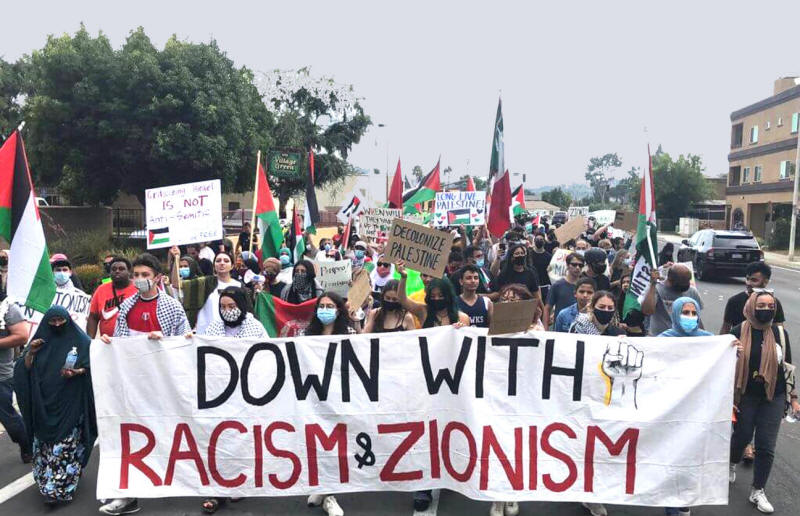 Die Aktion "Down With Racism, Zionism and White Supremacy" des Palestine Youth Movement San Diego, die am 25. Juli 2021 stattfand, richtete sich gegen die Anwesenheit von Mike Pompeo, der von Shield of David, einer zionistischen Organisation in El Cajon, CA, eingeladen worden war, um eine Rede zu halten.
