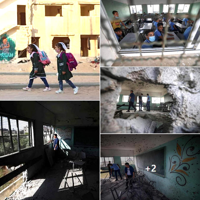 Palästinensische Schüler inspizieren am ersten Tag des neuen Schuljahres in Gaza-Stadt ein Klassenzimmer in einer Schule, die während des 11-tägigen israelischen Krieges gegen #Gaza zerstört wurde,