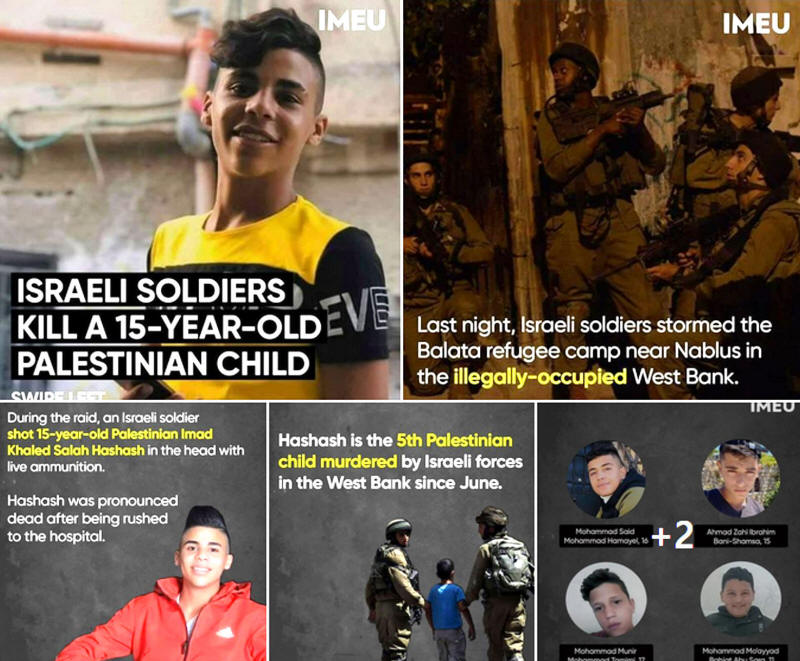 Am 24. 8. 2021n Abend stürmten die israelischen "Verteidigungs"-truppen (idf) das Flüchtlingslager Balata in der nähe von Nablus im illegal besetzten Westjordanland, den palästinensischen Gebieten. während der terroristischen Stürmung schoss ein "israelischer" Soldat dem 15-jährigen Emad Khaled Salah Hashash mit scharfer Munition in den Kopf.
