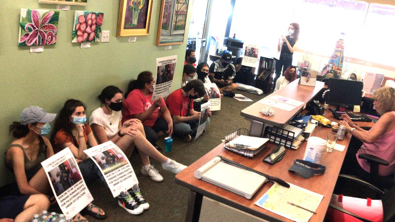 Der Anruf endete damit, dass Schakowsky HR 2590 nicht unterzeichnete, obwohl sie erklärte, dass sie sich die Sache "noch einmal ansehen" und mit anderen Abgeordneten sprechen würde. Wir setzten unseren Sitzstreik fort, legten das Bezirksbüro lahm und bestanden darauf, dass wir nicht akzeptieren würden, dass die Geschäfte weiterlaufen, während unser Volk in Palästina ethnisch gesäubert und getötet wird.