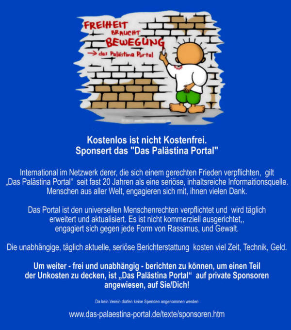 In einer ersten Stufe seines Entwicklungsplans mit dem Titel "Wirtschaft im Austausch für Sicherheit" solle die Infrastruktur im völlig verarmten Gazastreifen erneuert werden. "Das Elektrizitätssystem wird repariert, Gas wird angeschlossen, eine Meerwasser-Entsalzungsanlage gebaut, das Gesundheitssystem wird deutlich verbessert, und Häuser und Verkehrswesen werden wieder aufgebaut", sagte Lapid. In einer zweiten Stufe könnten ein Hafen sowie eine Verkehrsverbindung zwischen dem Gazastreifen und dem von Israel besetzten Westjordanland gebaut werden. mehr >>> |