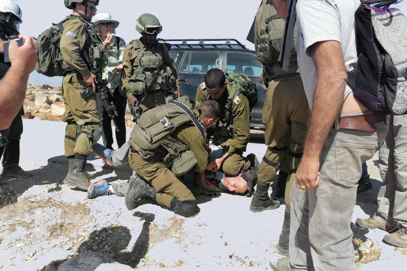 Ein israelischer Soldat kniet sich in den Nacken eines linken israelischen Aktivisten, der versucht, palästinensischen Gemeinden in den südlichen Hebron-Bergen Wasser zu bringen, 17. April 2021. (Osama Iliwat)
