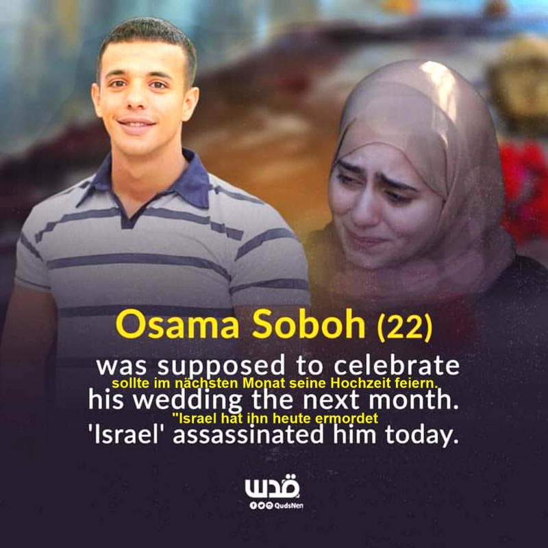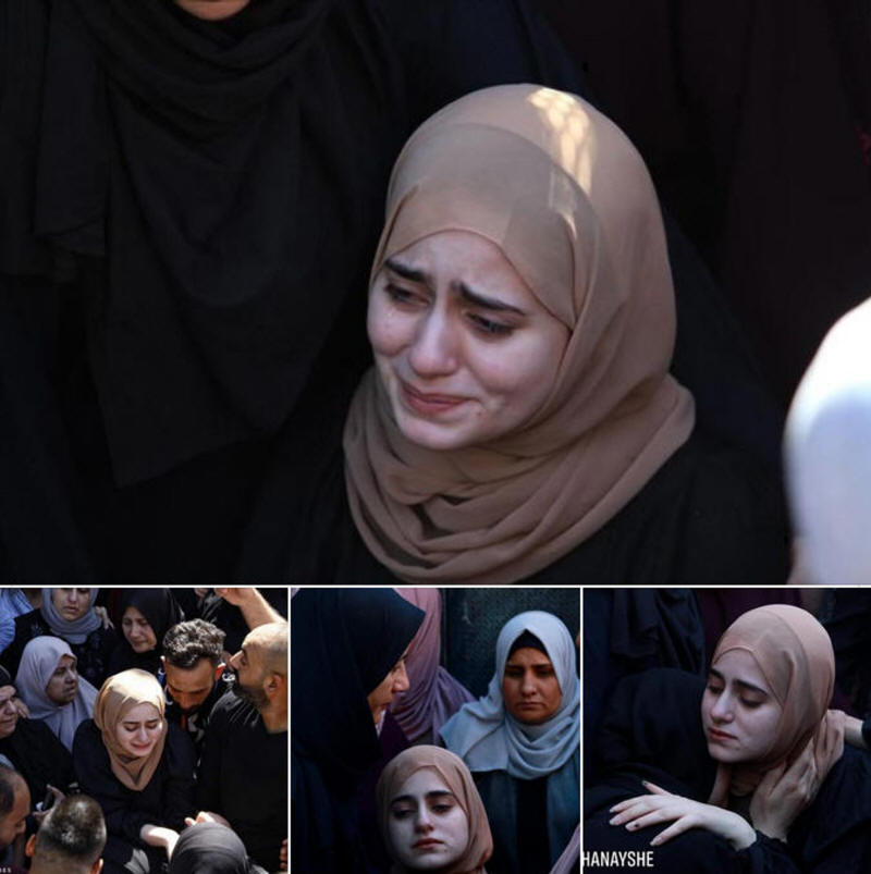 Dieses palästinensische Mädchen weint bei der Beerdigung ihres Verlobten Osama Sobh (22 Jahre alt), der heute Morgen von israelischen Terrorkräften ermordet wurde.