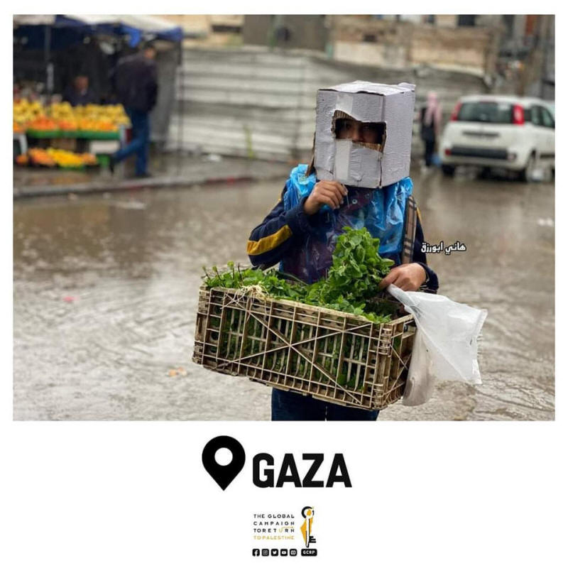 Ein palästinensisches Kind bedeckt seinen Kopf und Körper während des starken Regens in Gaza mit einem Pappkarton und einer Plastiktüte, um weiterhin sein Gemüse verkaufen zu können.