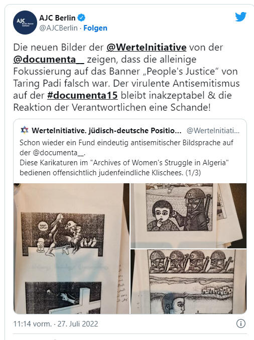 Der Beitrag verurteilte die Einladung des palästinensischen Kollektivs "The Question of Funding" (TQoF) zur documenta 15 und beschuldigte die Künstler, Nazi-Sympathisanten zu sein, weil sie zuvor in leitenden Positionen im Khalil Sakakini Cultural Center, einer bekannten gemeinnützigen Kunst- und Kulturorganisation mit Sitz in Ramallah im besetzten Westjordanland, tätig waren.
