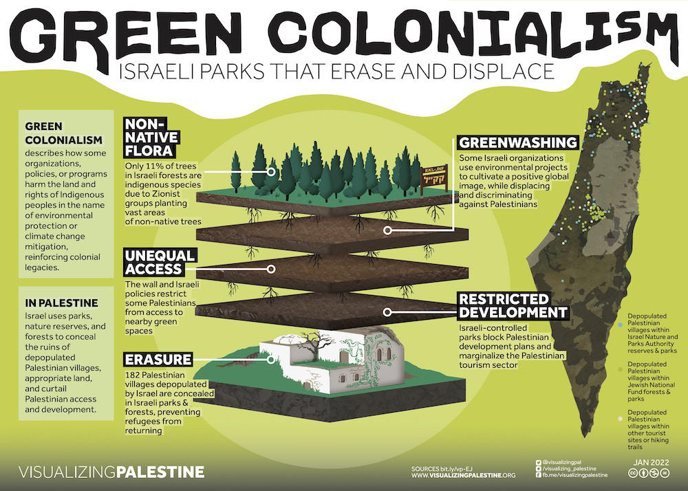 Giftmüll, Ressourcenausbeutung, Green Washing, Klimaanfälligkeit - das Einmaleins der menschengemachten Umweltprobleme, denen sich Palästinenser*innen infolge der israelischen Besatzung und Ungleichbehandlung ausgesetzt sehen, präsentiert von Visualizing Palestine. Passend zum "Aufforstungsprojekt" des JNF, das Palästinenser*innen aus ihrer Heimat vertreibt: Die Grafik zum vergrößern anklicken.