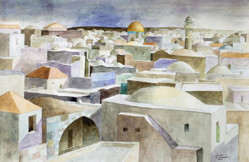 Jerusalem Rooftops ist eine von zwei ausgestellten Arbeiten von Suleiman Mansour (MEE/Zawyeh Gallery)