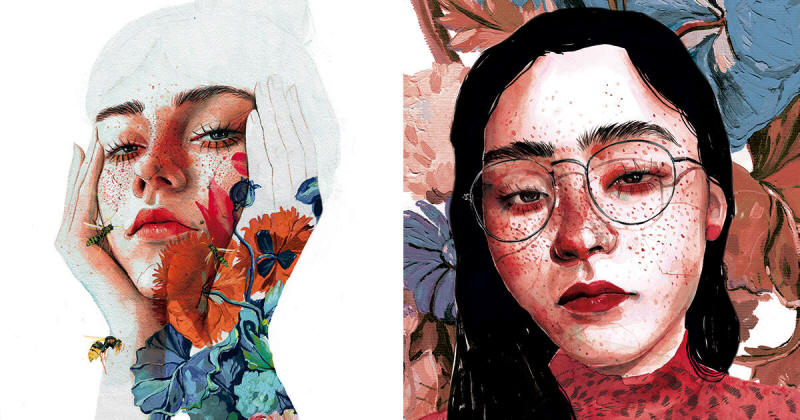 Ausdrucksstarke Porträts, Strichzeichnungen und Blätter werden von Ana Santos (Mehrt Arbeiten von Ana Santos) in reichhaltigen Illustrationen überlagert