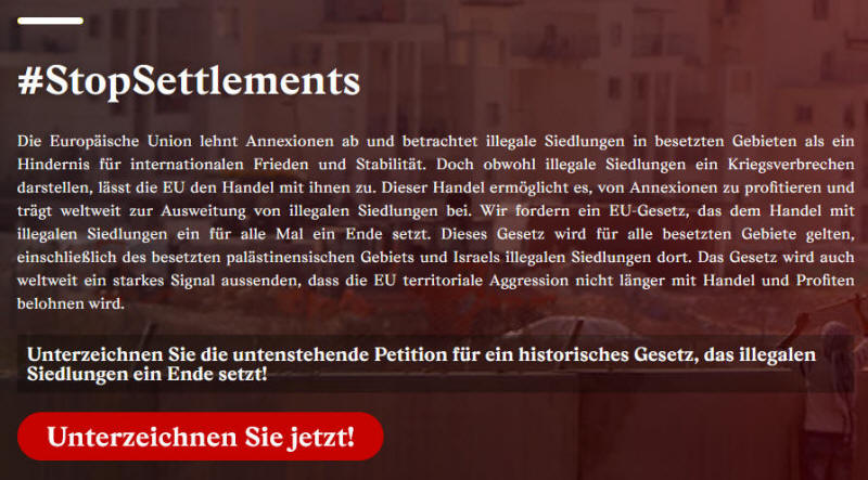In der Petition werden die europäischen Staaten und Abgeordneten aufgefordert, Gesetze zu verabschieden, die die Einfuhr von in illegalen israelischen Siedlungen hergestellten Produkten verbieten und die Ausfuhr von EU-Produkten dorthin untersagen.