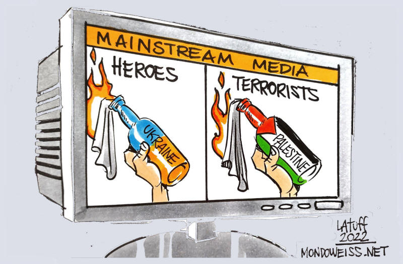 Die europäischen und amerikanischen Medien, die ukrainische Zivilisten für das Bauen von Molotow-Cocktails feiern, sind dieselben, die Palästinenser dafür verurteilen, dass sie auch nur einen Stein in die Hand nehmen, um sich gegen die militärische Besatzung zu wehren.